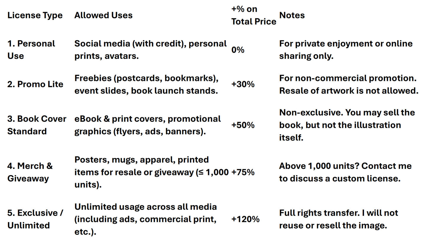 Authors, I hear you! Here you can find the current license options. Have a question? Send me an email!